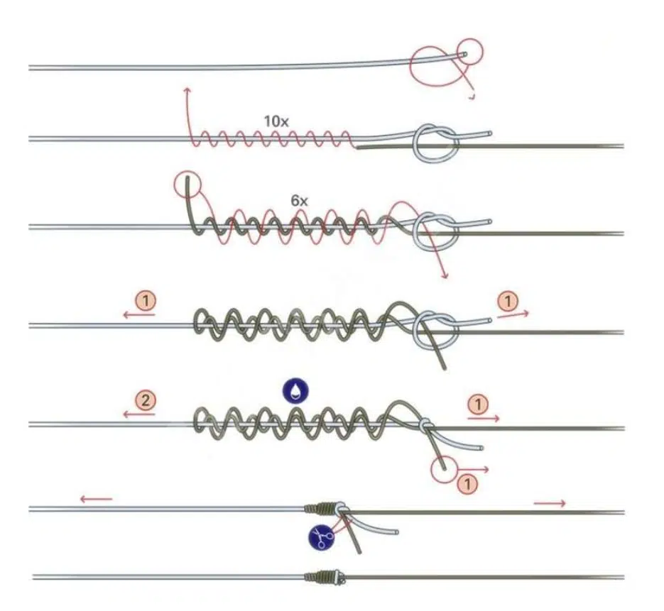- Legarea unui leader de fluorocarbon (invizibil în apă) la un fir principal împletit (pentru sensibilitate și rezistență).